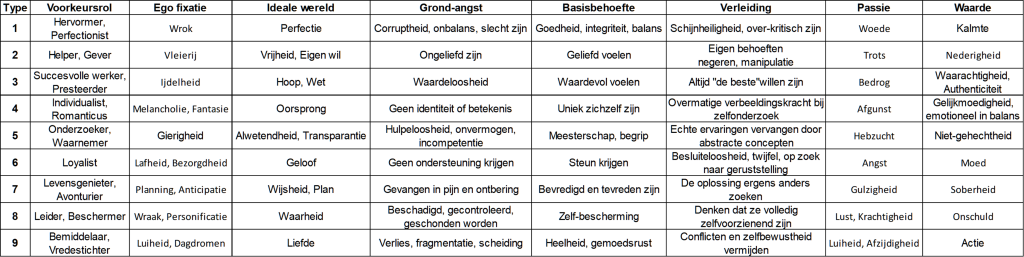 Het enneagram model zegt dat je eerste reactie op de nieuwe wereld voor de rest van je leven je intrinsieke gedrag bepaalt. De negen persoonlijkheidstypen zijn (zie o.a. Wikipedia; lees hier meer als je geïnteresseerd bent) – klik om te vergroten: